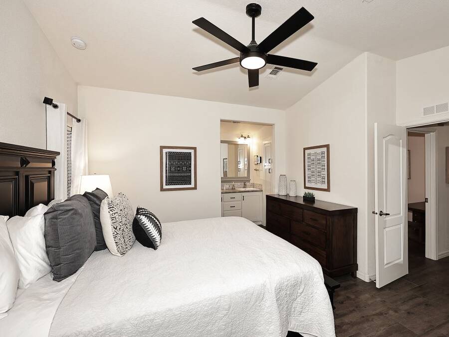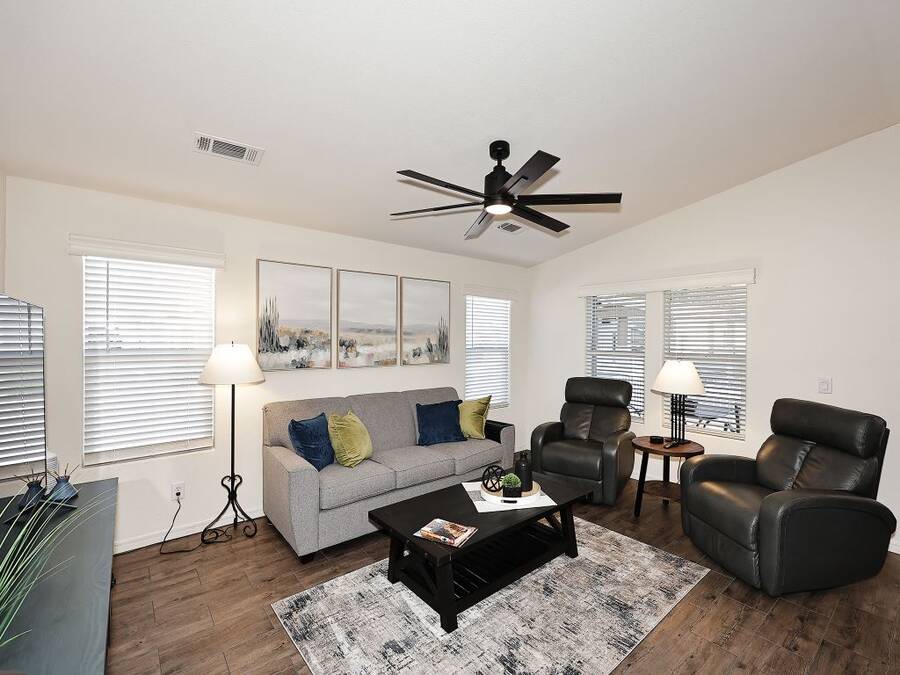 Step inside this fully furnished home to find an open-concept floor plan, element flooring throughout, high ceilings, natural light. The upgraded kitchen boasts formica countertops, stainless steel appliances, two-toned, wood, beadboard cabinetry, and a kitchen island, perfect for both everyday living and entertaining. The spacious primary suite offers a peaceful retreat, complete with en-suite features like dual sinks, double walk-in shower with bench seat, and a walk-in closet. Additional bedroom provides versatility for guests, a home office, with a trundle bed and desk. Outside you will enjoy the Arizona weather from the front porch, screened carport gives a private patio option ideal for entertaining or unwinding, and storage shed complete with mini-split AC.