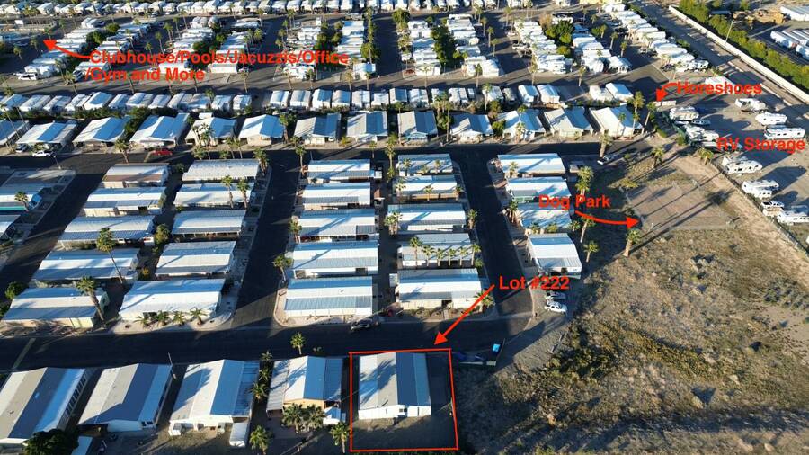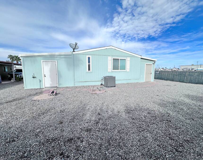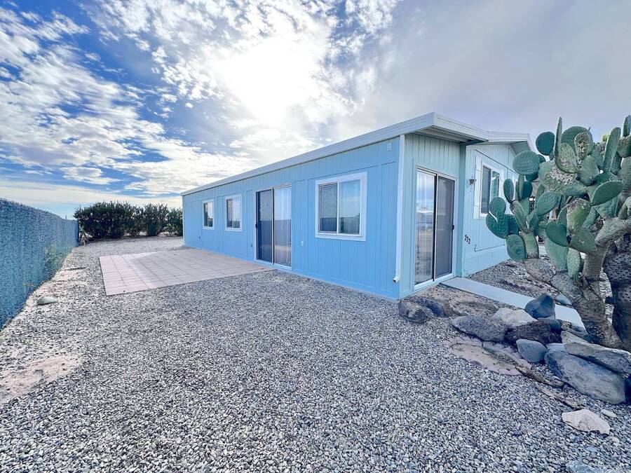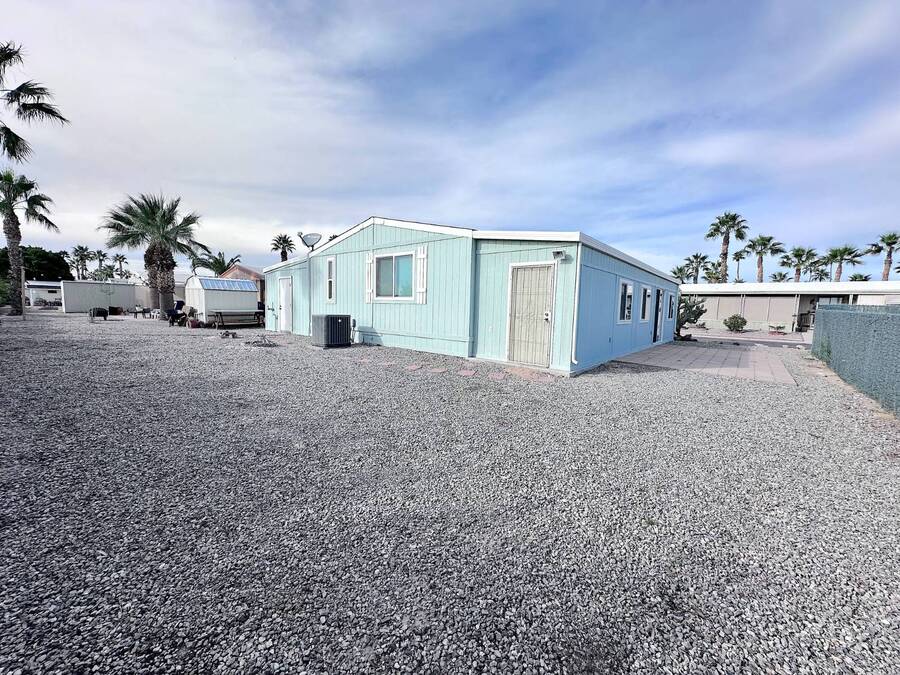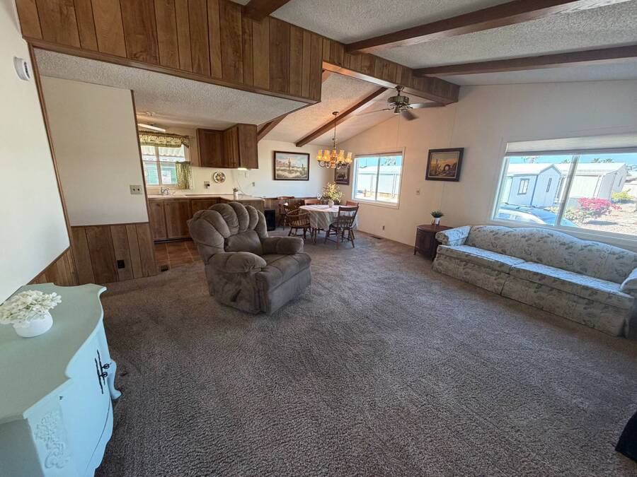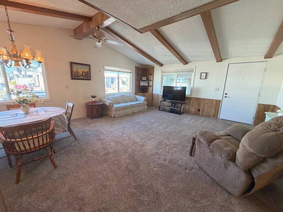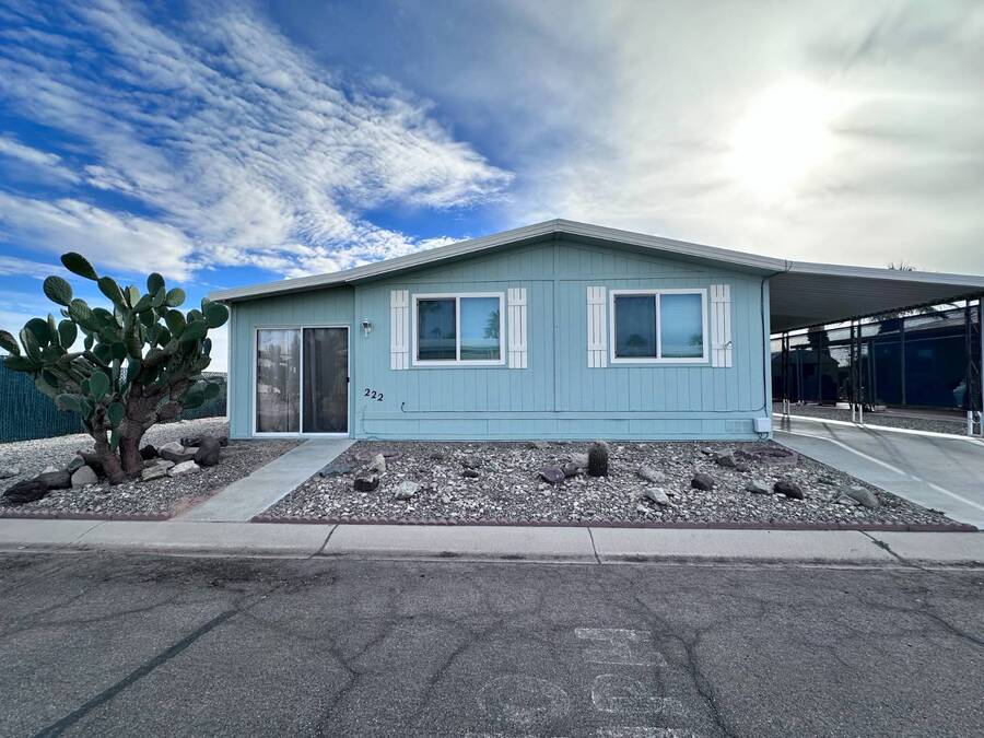 Step into this well maintained 2-bedroom, 2 bath home featuring vaulted ceilings that create a spacious feel, a large primary bedroom with an ensuite bath for privacy. Every detail has been thoughtfully considered from the updated fresh paint throughout the entire home, dual pane windows throughout to the reverse osmosis system in the kitchen, and blinds. The washer and dryer are included, and comes partially furnished, but a no-furniture option is available if you prefer to bring your own style. Outside, you'll love the prime corner lot location with plenty of outdoor living space! The fully landscaped yard features easy-care landscaping. The covered carport provides shade and protection for your vehicles, while the shed with electric offers extra storage or workshop space. Enjoy the Arizona room, which leads out to a large outdoor patio with eastern exposure providing plenty of shade in the summer months. Located in Mesa Verde, a 55+ community, you're just minutes from shopping, dining, and golf courses. The land lease of $631.12 includes water, sewer, and garbage offering true low-maintenance living! The community amenities include two pools, two jacuzzis, fitness area, 2 billiard rooms, 2 card rooms, horseshoes, dog park, and shuffleboard - everything you need for an active, social lifestyle!