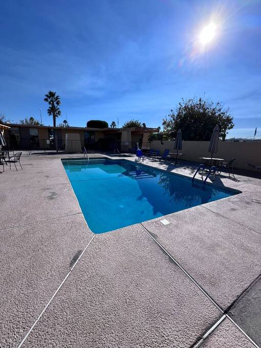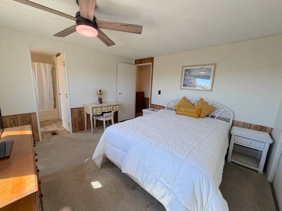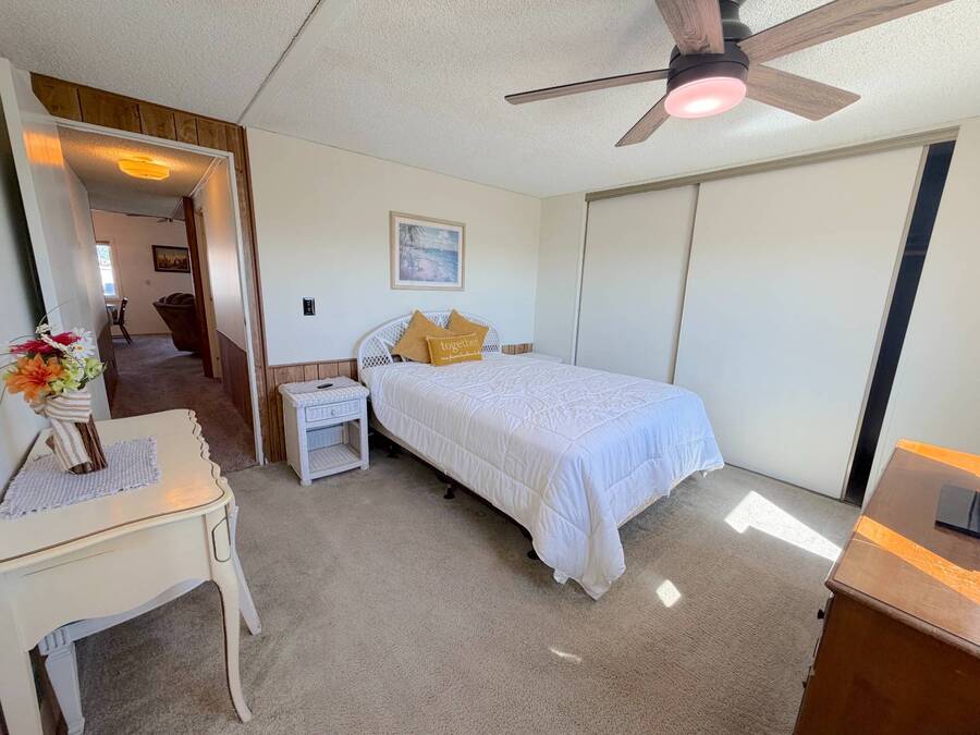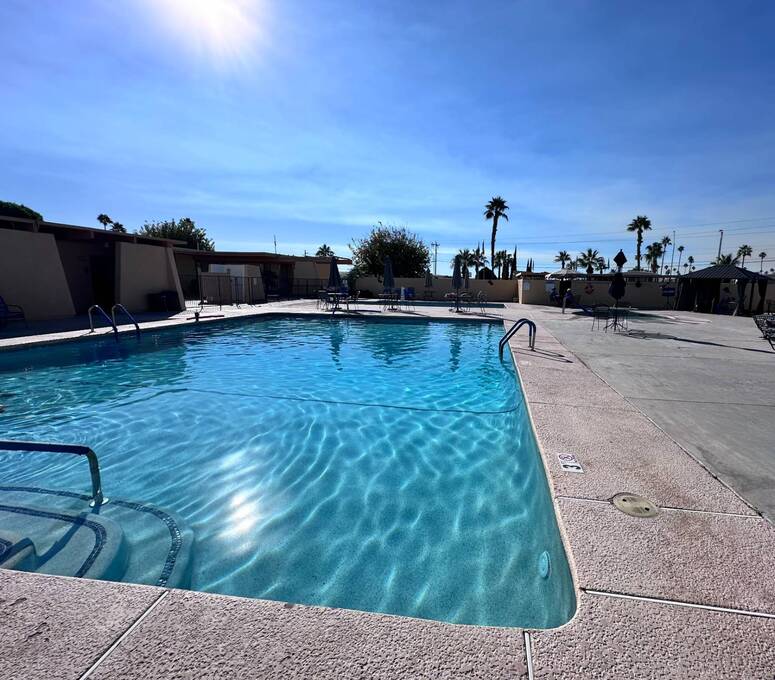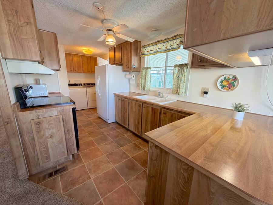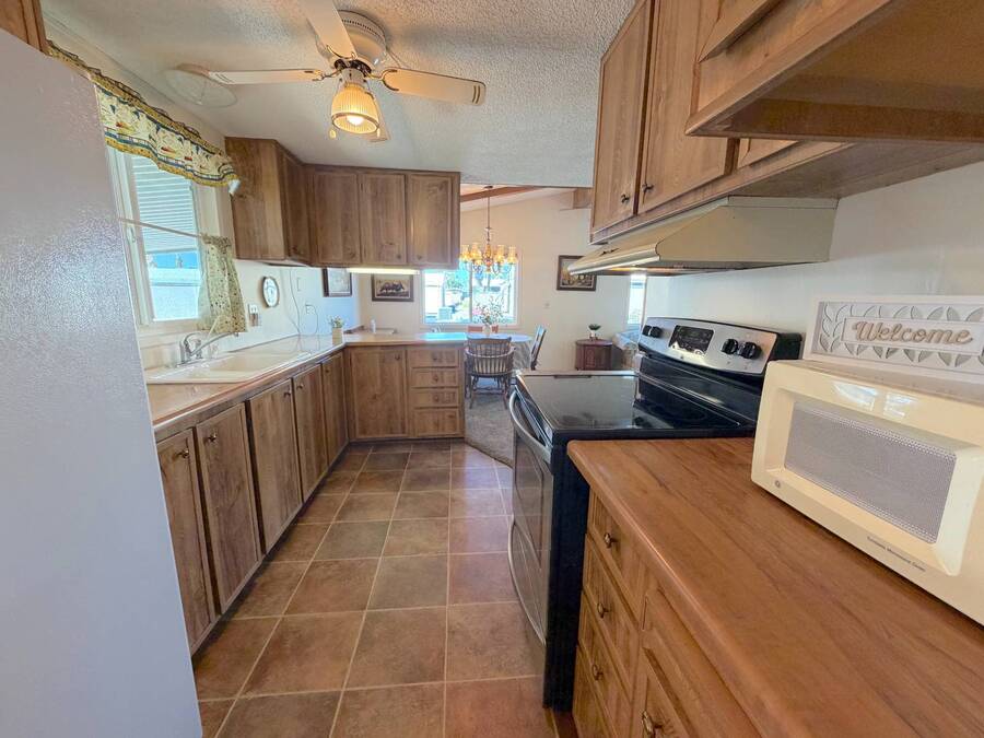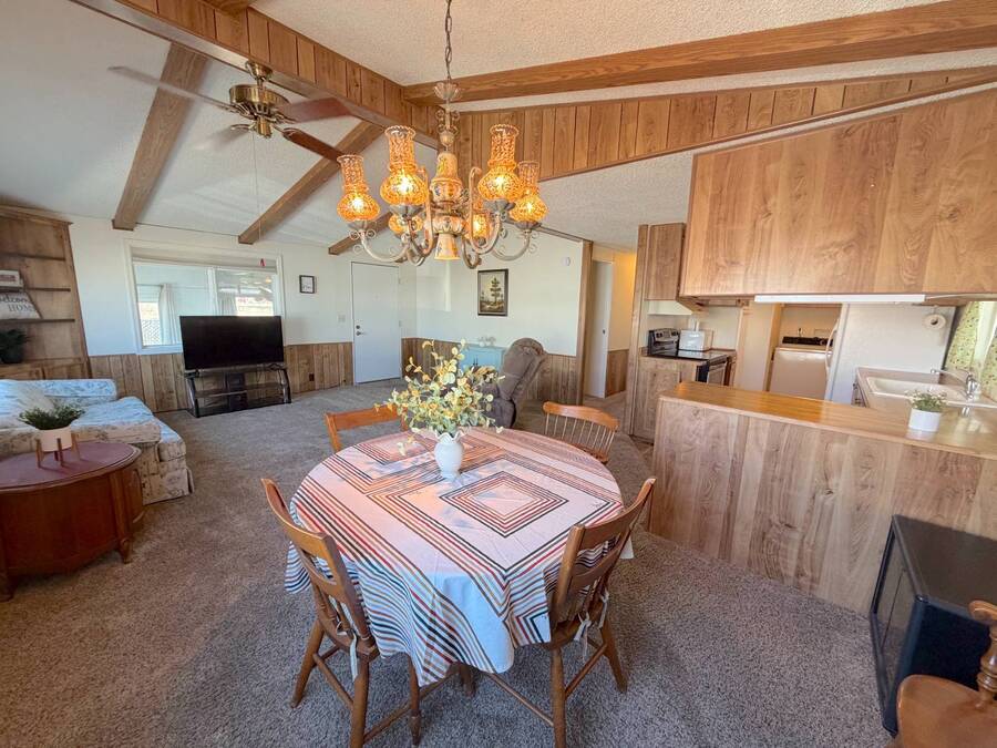 Step into this well maintained 2-bedroom, 2 bath home featuring vaulted ceilings that create a spacious feel, a large primary bedroom with an ensuite bath for privacy. Every detail has been thoughtfully considered from the updated fresh paint throughout the entire home, dual pane windows throughout to the reverse osmosis system in the kitchen, and blinds. The washer and dryer are included, and comes partially furnished, but a no-furniture option is available if you prefer to bring your own style. Outside, you'll love the prime corner lot location with plenty of outdoor living space! The fully landscaped yard features easy-care landscaping. The covered carport provides shade and protection for your vehicles, while the shed with electric offers extra storage or workshop space. Enjoy the Arizona room, which leads out to a large outdoor patio with eastern exposure providing plenty of shade in the summer months. Located in Mesa Verde, a 55+ community, you're just minutes from shopping, dining, and golf courses. The land lease of $631.12 includes water, sewer, and garbage offering true low-maintenance living! The community amenities include two pools, two jacuzzis, fitness area, 2 billiard rooms, 2 card rooms, horseshoes, dog park, and shuffleboard - everything you need for an active, social lifestyle!
