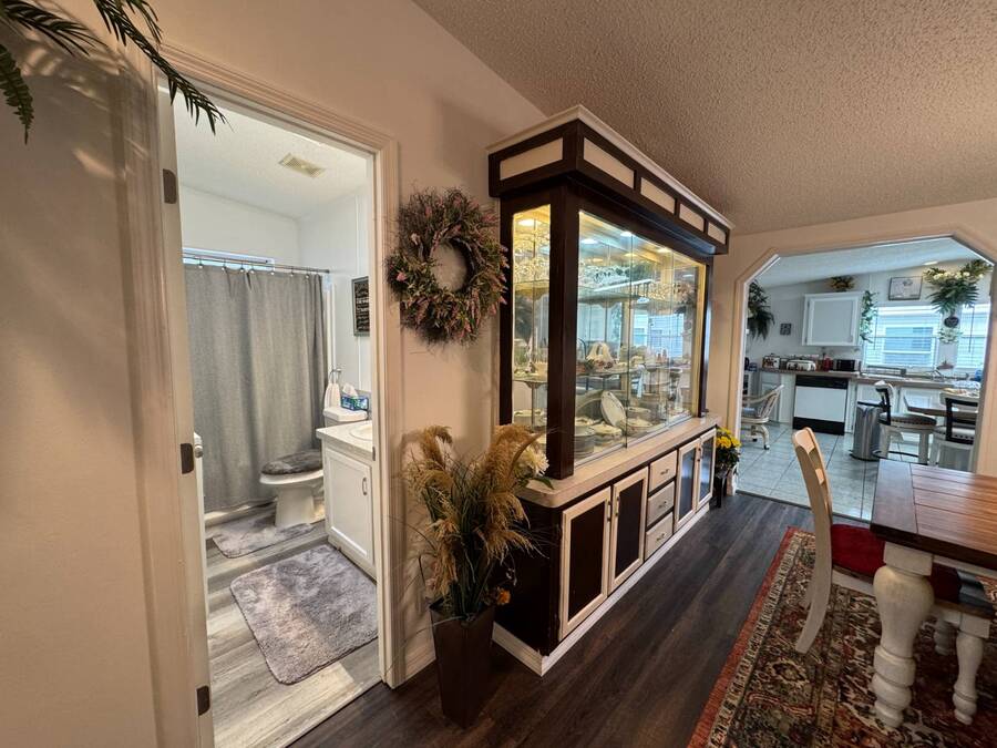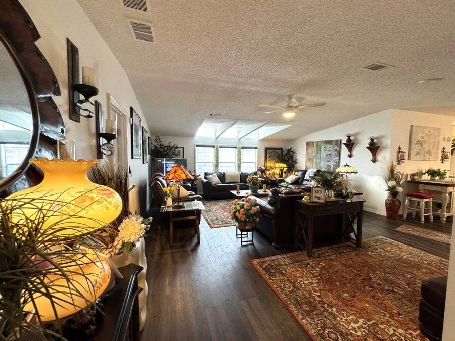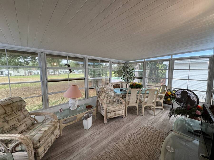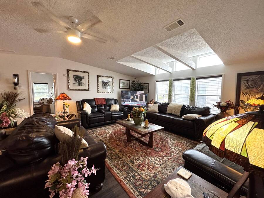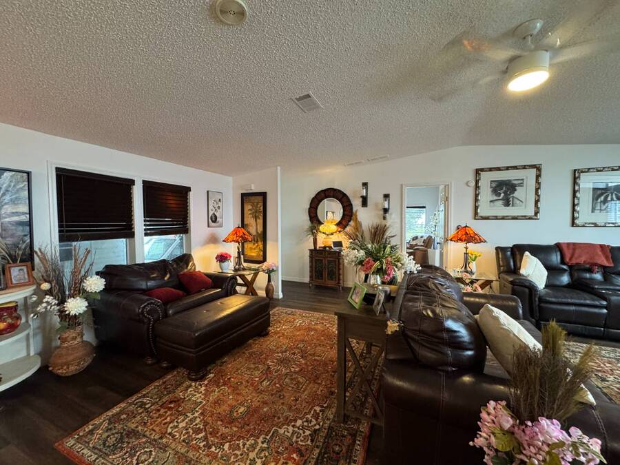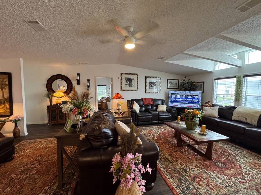Discover this triple-wide manufactured home located in the popular Schalamar Creek and Country Club, located just outside Lakeland, FL. It is conveniently located between Tampa and Orlando with easy access to both coasts, theme parks, shopping, medical service facilities, and sporting and entertainment attractions. This spacious home boasts an open floor plan with over 1700 sq ft, including 3 large bedrooms, 2 sizeable bathrooms, a large kitchen with a big island, a large living room, a formal dining area, and a separate laundry room. The lot lease is currently $1,145/month. The large enclosed lanai and outdoor patio offer additional living space to enjoy the Florida lifestyle and/or entertain family/friends. There is newer vinyl plank flooring throughout the main living areas. Other key features of this home include the crown molding, natural light, tray ceilings, cathedral ceilings, oversized primary bedroom, newer refrigerator, and a roof that is about 5 years old. This home is located on a scenic lot overlooking the 14th hole of the professionally designed golf course. There is a golf cart included with the sale. Schalamar Creek is a gated 55+, pet-friendly resort that is tucked away on 500 acres of waterways, offering all the amenities and natural beauty that the Florida lifestyle is known for. Some of the amenities are a full-service restaurant, an 18-hole championship golf course, a pro shop, tennis courts, pickleball courts, putting greens, a driving range, lake access, fitness center, clubhouse, heated and fitness pools, etc. It is an active community with entertainment, church services, dances, potlucks, card games, group travel opportunities, and much more. Don't miss this incredible opportunity! Schedule your private in-person or virtual showing today and explore everything this vibrant community has to offer. All listing information is deemed reliable but not guaranteed and should be independently verified through personal inspection by appropriate professionals. Our company does not and cannot guarantee or warrant the accuracy of this information or the condition of this property. Measurements are approximate. The buyer assumes full responsibility for obtaining all current rates of lot rent, fees, and pass-on costs. Additionally, the buyer is responsible for obtaining all rules, regulations, pet policies, etc., associated with the community, park, or home from the community/park manager. Our company is not responsible for quoting said fees or policies. Financing is available through 3rd party lenders. The sales price does not include tax, dealer fees, or administrative fees. Please contact one of the sales agents for additional information.