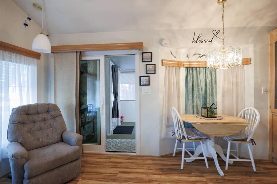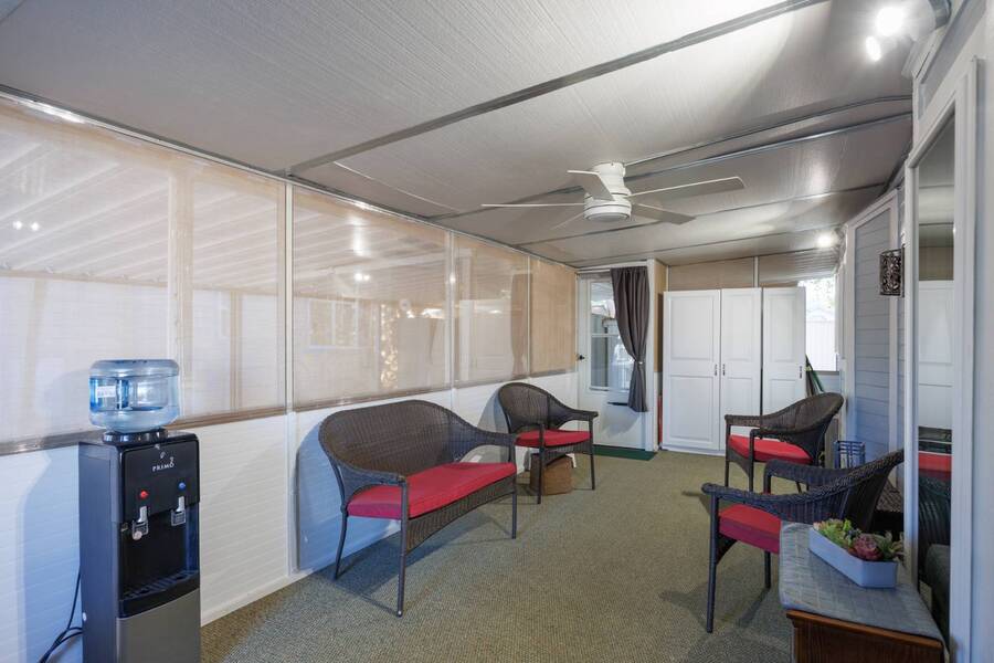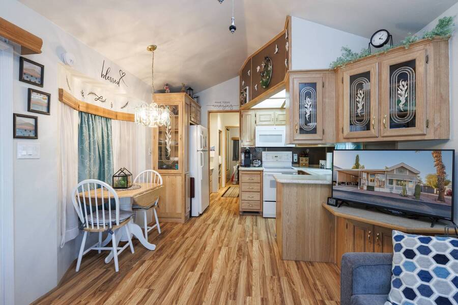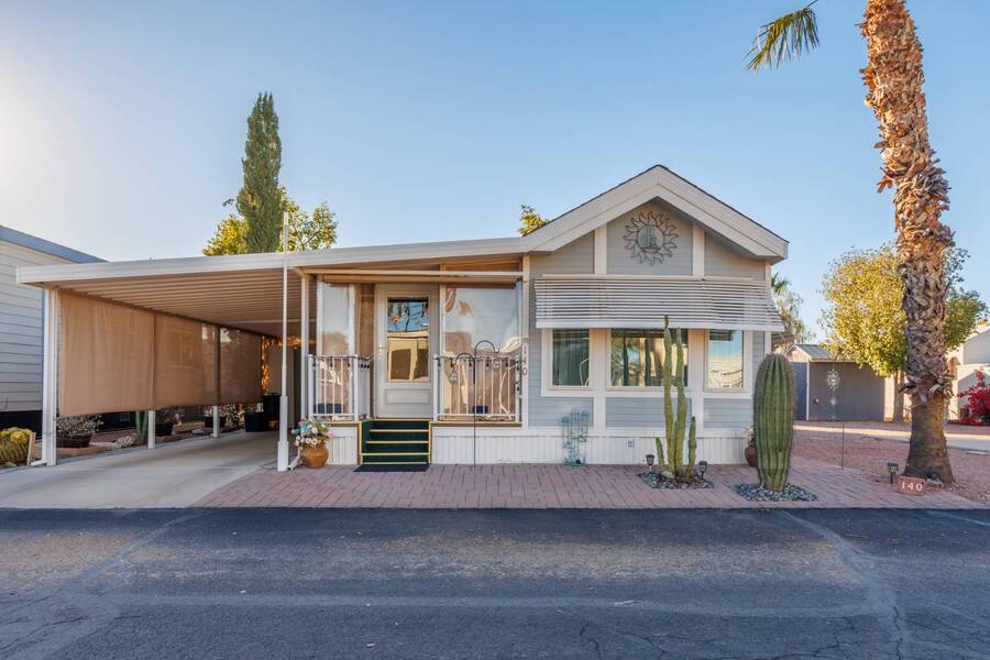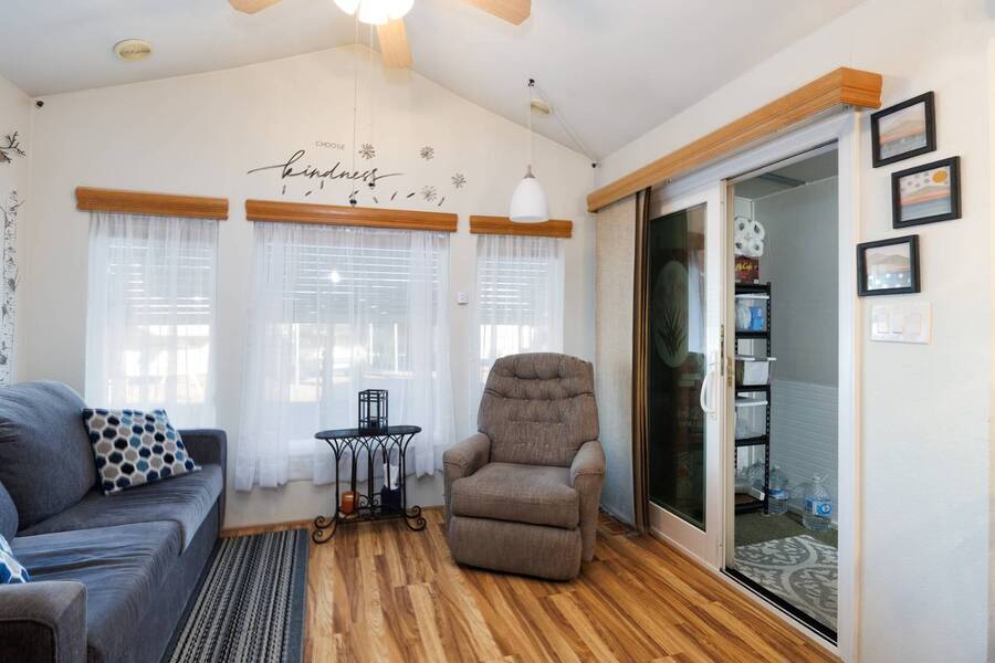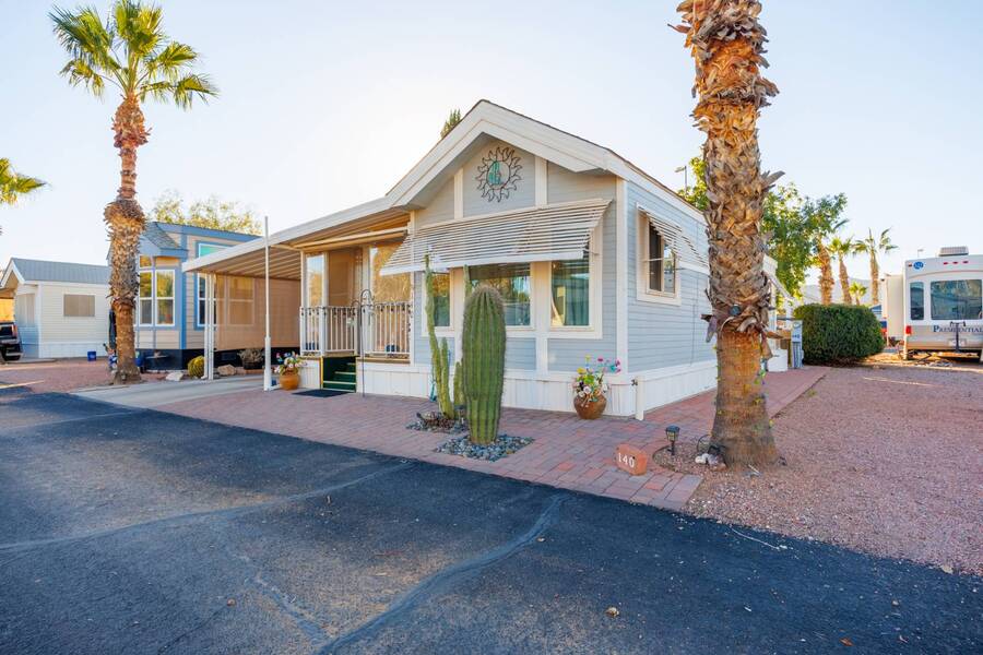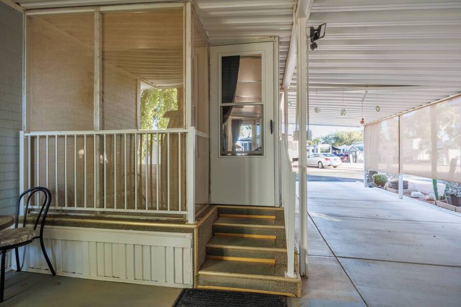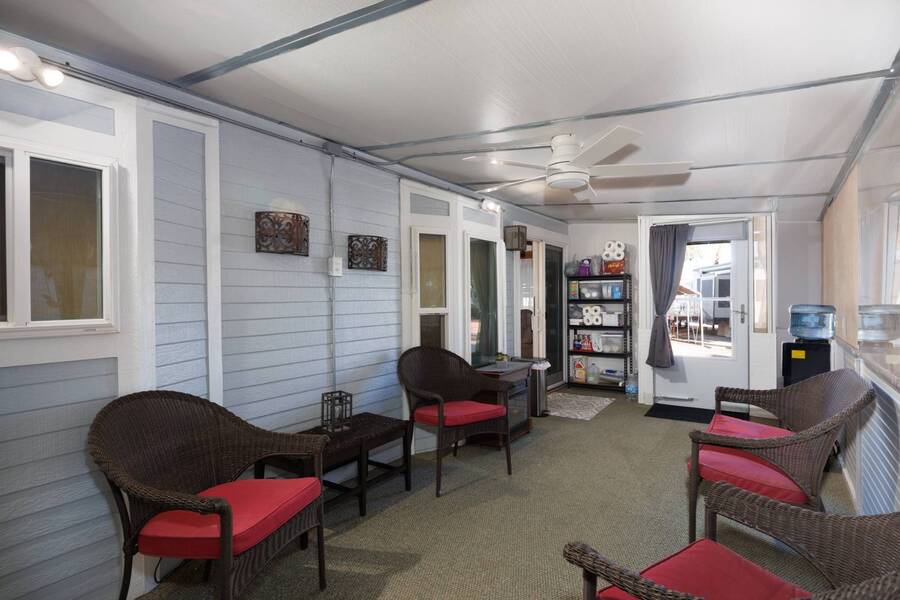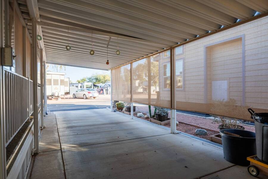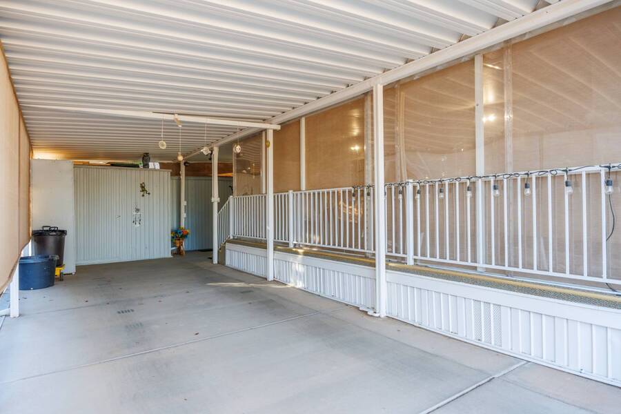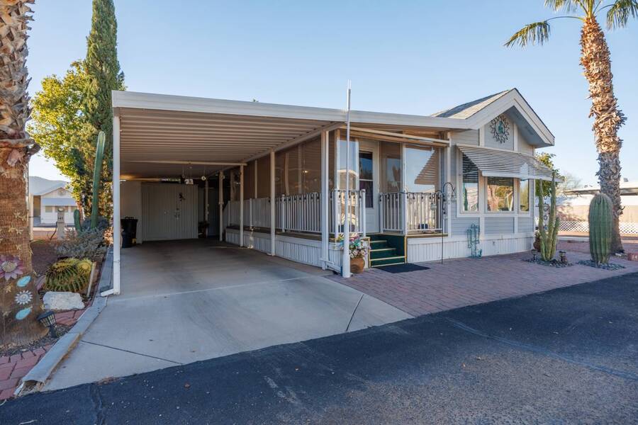 Welcome to your furnished, move-in ready park model in the desirable 55+ Las Colinas RV Park in Eloy, AZ! This beautifully maintained home features a new roof, vaulted ceilings, and a bright, open layout. Enjoy the year-round comfort of the enclosed, insulated porch and the convenience of a hallway office nook. The property includes a stacked washer/dryer (in the shed), an attached carport, tasteful landscaping with irrigation, and a private backyard with an orange tree and block fence. Located in an active 55+ community with amenities and activities, this home offers easy, low-maintenance living. Just bring your suitcase!
