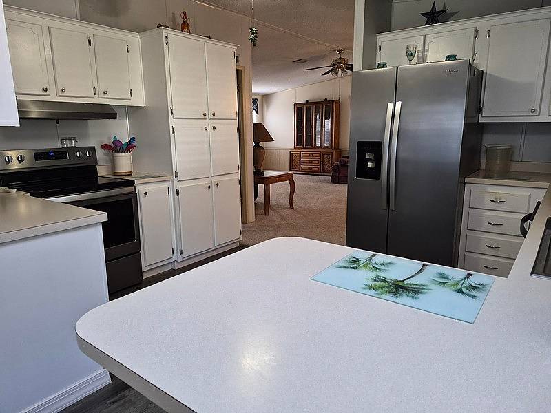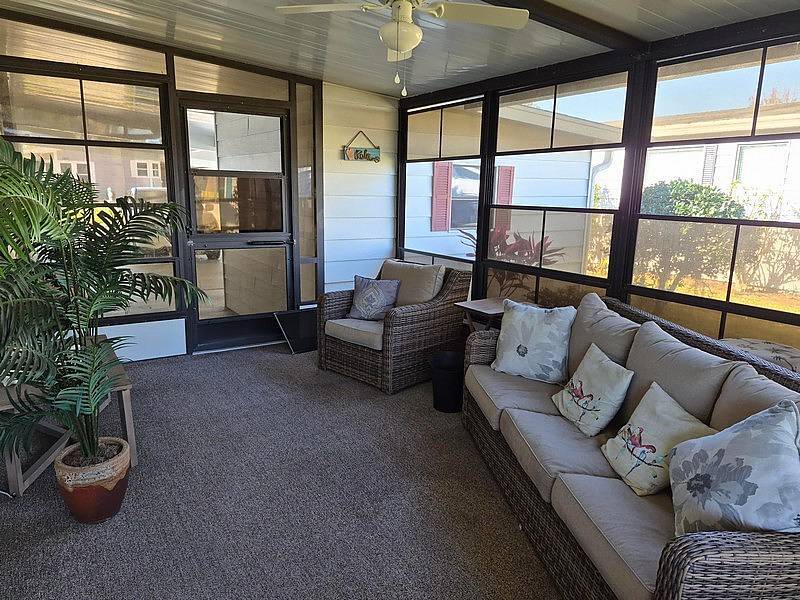 Come see this beautifully maintained 3-bedroom, 2-bath home with a split floor plan, offering comfort, space, and numerous updates. The home is partially furnished and features a double carport along with an oversized shed, perfect for storage, hobbies, or a workshop. Improvements provide peace of mind, including a roof installed in 2013, brand-new AC in 2025, water heater in 2024, double-pane windows, and PVC plumbing throughout. Inside, the kitchen has been freshly painted and offers stainless steel appliances, durable vinyl plank flooring, and a welcoming eat-in dining area. A convenient hideaway laundry room is located just off the kitchen for added functionality. The home also features a separate formal dining room with a built-in cabinet, ideal for entertaining, and it opens nicely to the living room. The living room and bedrooms are finished with newer Berber carpet, creating a warm and cozy feel throughout the home. The spacious primary bedroom includes walk-in closets with additional storage, while the updated primary bathroom boasts a new walk-in shower, new vanity, and raised toilet. The guest bedrooms are generously sized and located on the opposite side of the home, offering privacy for family or visitors. Relax and unwind in the Florida room, an ideal space for entertaining guests, enjoying your morning coffee, or relaxing at the end of the day. The home is conveniently located near the clubhouse, making it easy to enjoy all the communities planned activities, amenities, and social events. Whether you are searching for a snowbird retreat or a comfortable year-round residence, this home is move-in ready and checks all the boxes. Call today to schedule your private showing!