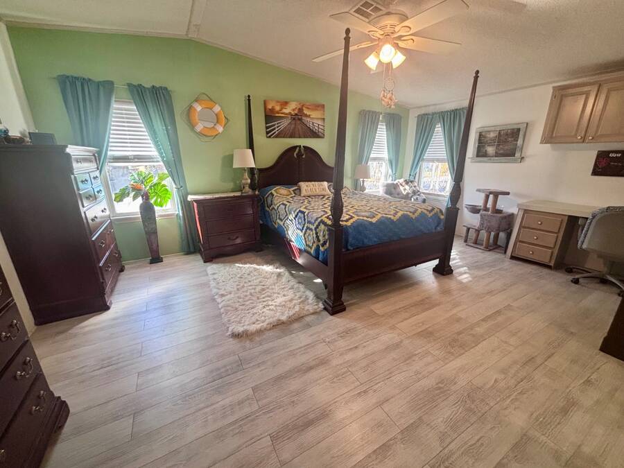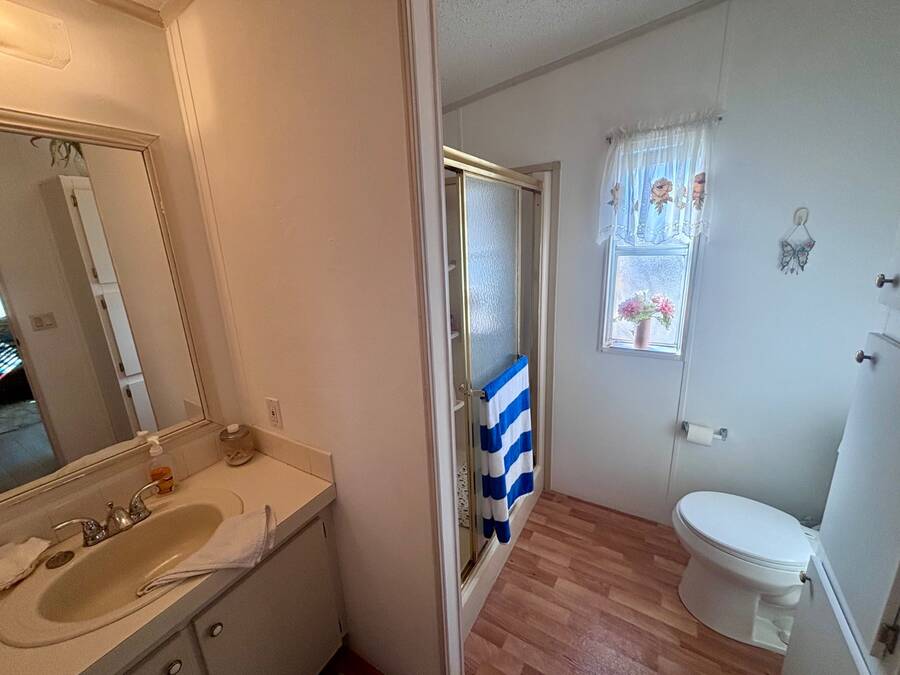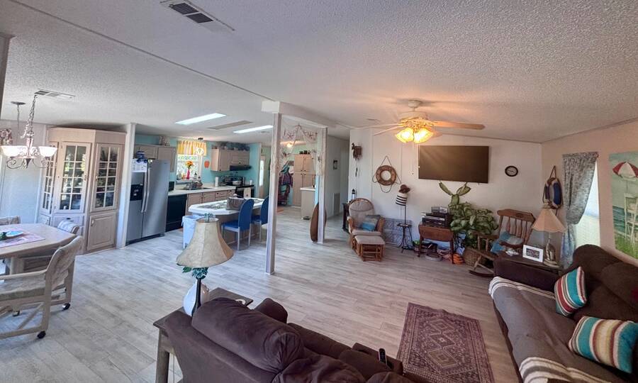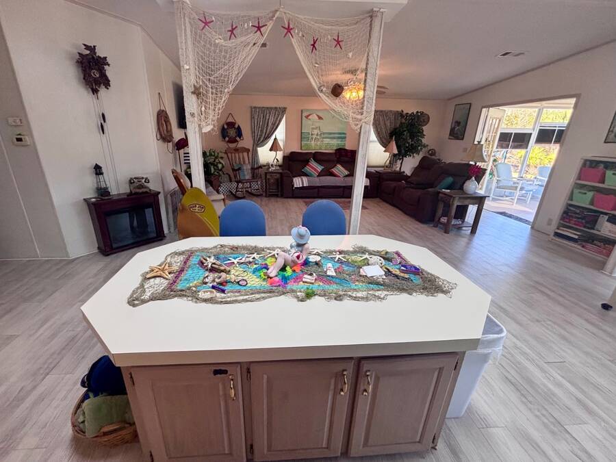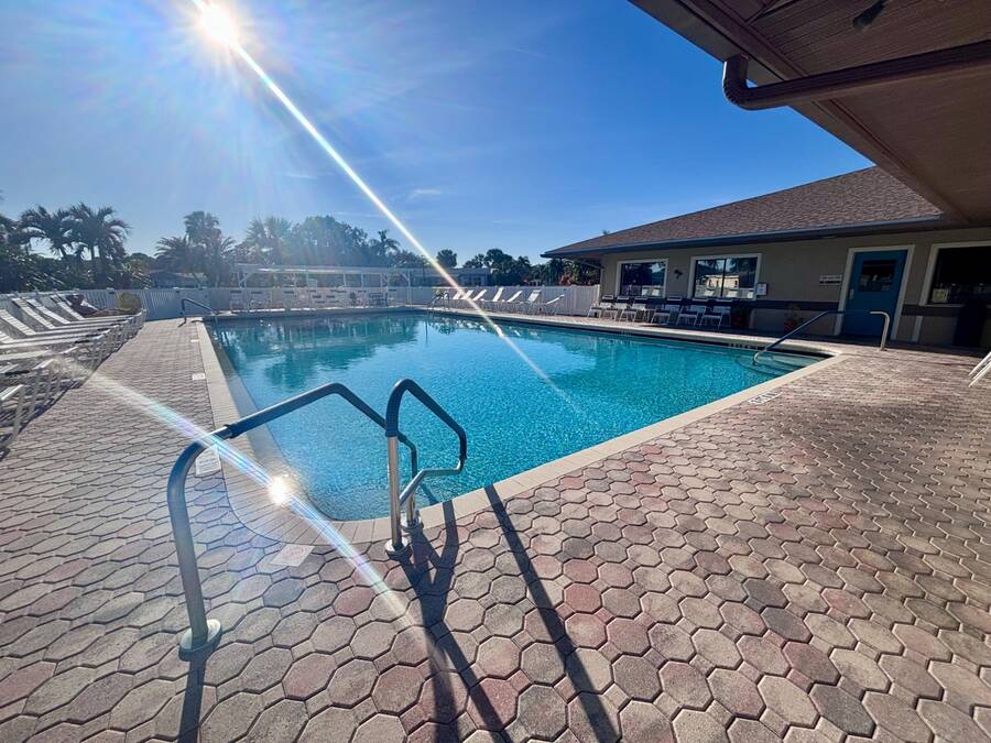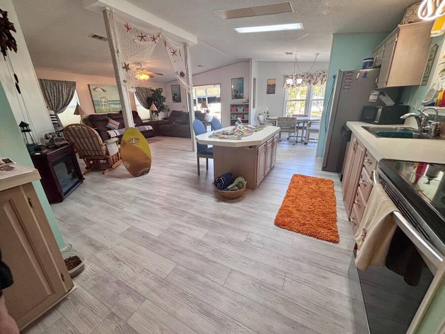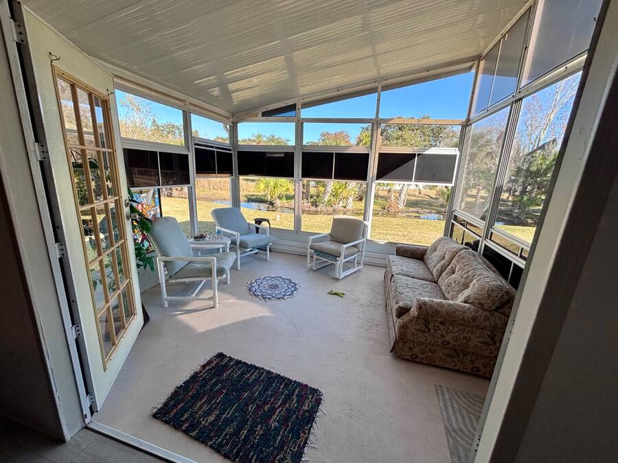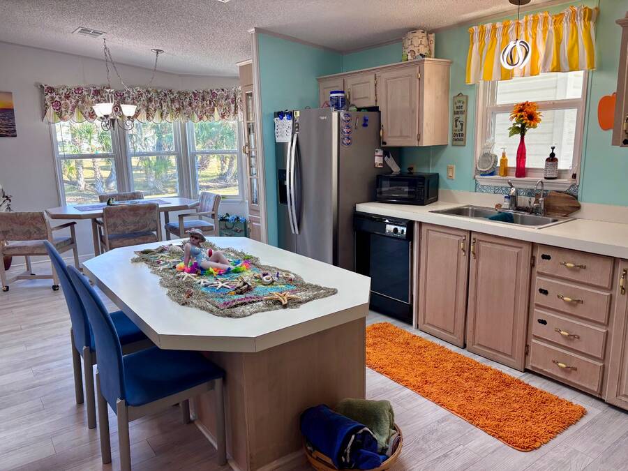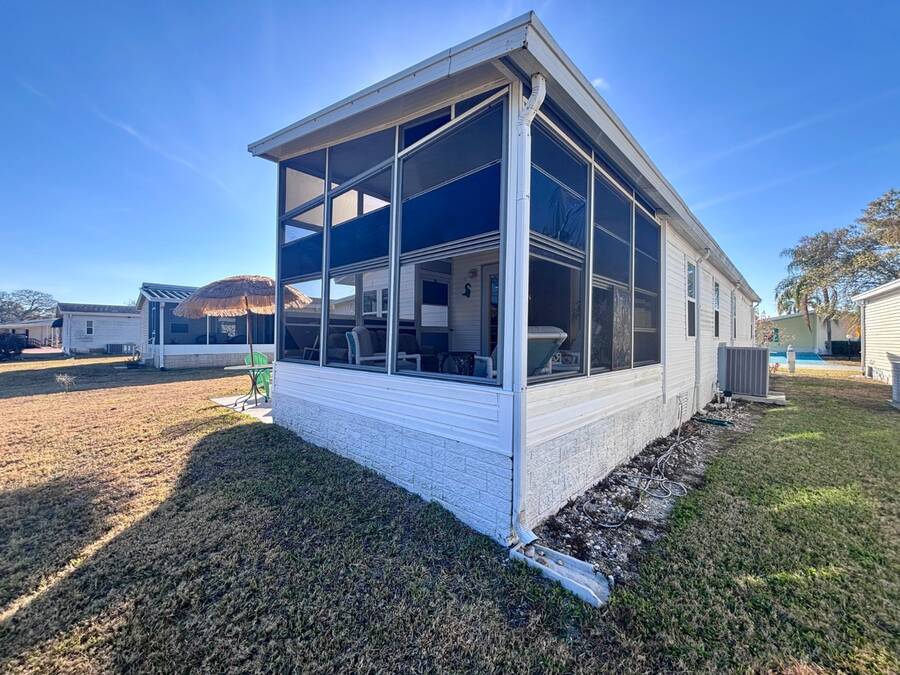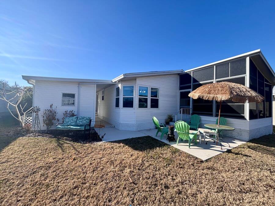 Welcome to easy Florida living in this beautifully updated 2-bedroom, 2-bath mobile home featuring a bright, open floor plan designed for comfort and entertaining. The spacious living and dining areas flow seamlessly together, enhanced by all-new flooring throughout - no carpet anywhere for a clean, modern feel and very pet friendly. The kitchen opens to the main living space, making it perfect for hosting or everyday living. Step through elegant French doors into your screened-in patio, where you can relax and enjoy peaceful water views and Florida breezes year-round. The large backyard offers plenty of space for gardening, pets, or simply soaking up the sunshine. Major updates provide peace of mind, including a newer roof, A/C, and water heater.Stackable washer and dryer is located inside the home, however there are hooks in the shed as well. Located in a desirable gated 55+ community of Island Lakes, residents enjoy resort-style amenities including a pool, spa, clubhouse, fitness center, and more. Lot rent includes trash service and cable, adding extra value and convenience. Whether you're looking for a seasonal retreat or full-time residence, this move-in-ready home offers comfort, style, and a lifestyle you'll love.