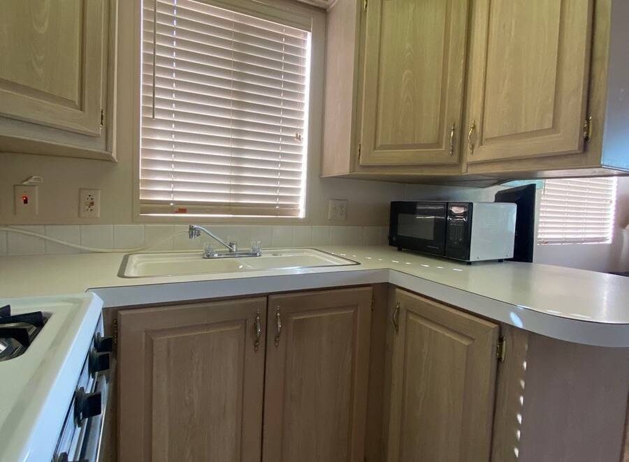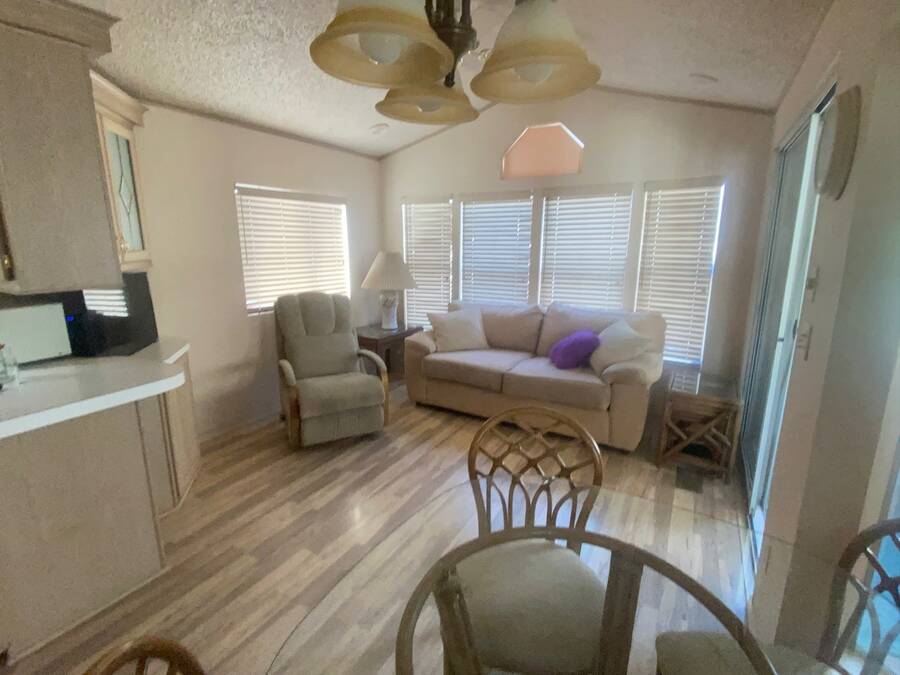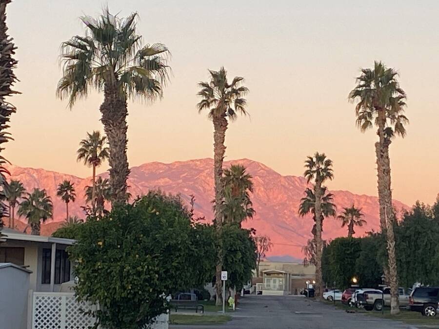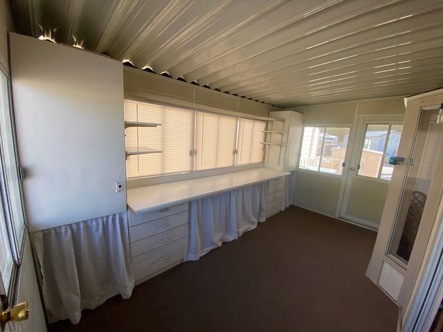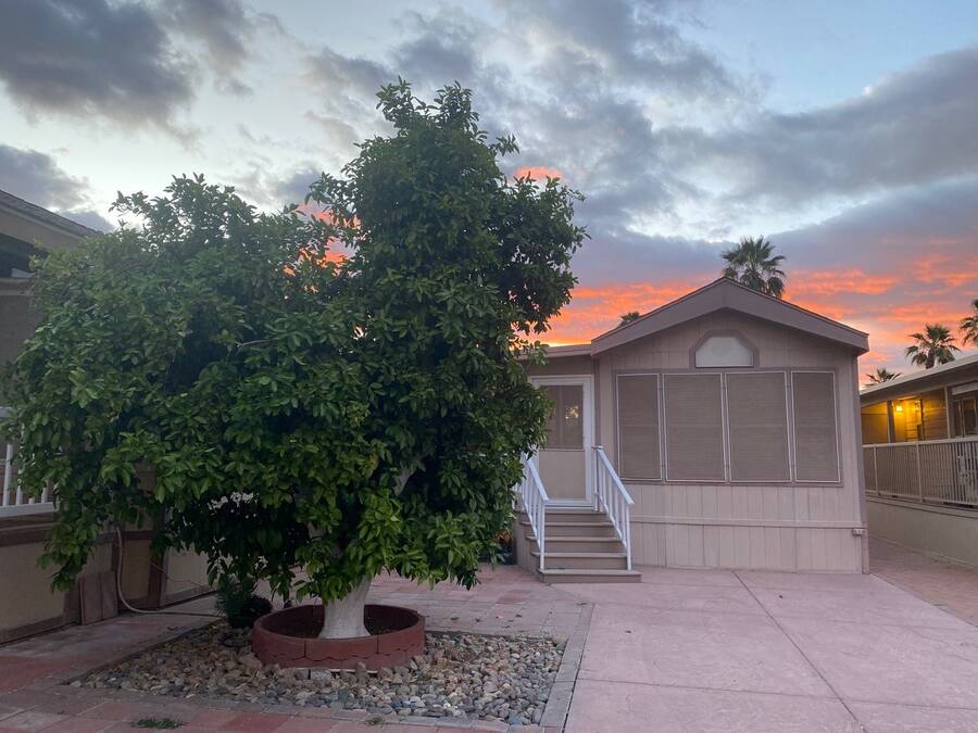 Lovingly cared for 1-bedroom 1-bath park model in Indian Wells RV Resort, Indio. Beautiful view of Mt. San Jacinto, a large enclosed porch, and a covered porch, all on the north side. Gorgeous grapefruit tree welcomes you spacious patios in front and back of the unit. Two parking spaces and a shed are on the property. The bedroom features convenient built-ins providing extra storage. The kitchen has an efficient setup for ease of cooking. Stove, oven, refrigerator included. Kitchen cabinets are plentiful gas stove/double propane tanks. The full bathroom has a skylight, a huge mirror over the vanity, a dual flush toilet, a 50 bathtub with a large deluxe specialty showerhead, and a secondary door into the bedroom. Excellent water heater, a/c, and heating systems. Hardwood Laminate flooring. Porch with custom wall built-ins, make this enclosed porch your dream hobby space. This RV park model is licensed with the California Department of Motor Vehicles. Indian Wells Sun RV Community is a gated community in Indio and has many amenities to enjoy. 3 pools, 2 spas, fitness room, dog park, clubhouse, shuffleboard, playground and more. Indian Wells - Sun RV Community is located to the south of Shields Date Farm and close to golfing, tennis, shopping and entertainment. Site rent includes water and trash. Annual lease required. Buyer to qualify with community office before purchase.